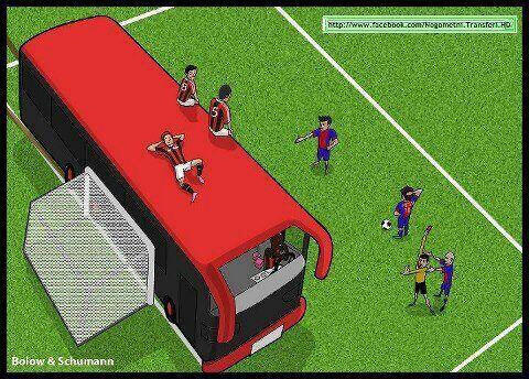 Berikut ini adalah gambar-gambar karikatur lucu strategi Ac Milan saat harus bertemu Barcelona saat Leg kedua. Dalam gambar statistik yang berbentuk karikatur, AC Milan memasang strategi bertahan habis-habisan dalam menghadapi Barcelona di Leg ke 2 liga Champion. Dalam Gambar karikatur tersebut terlihat Elsharawy dipasang sendiri di depan sebagai striker tunggal, Selebihnya para pemain AC Milan bertahan. Mungkin hal ini dilakukan supaya AC MIlan tidak kehilangan poin. Namun, Barcelona telah mempersiapkan para punggawanya seperti terlihat di starting line ada beberapa nama pemain kawakan, seperti Valdes, Mascherano, Pique, Xavi, Iniesta, Messi, dan Villa.